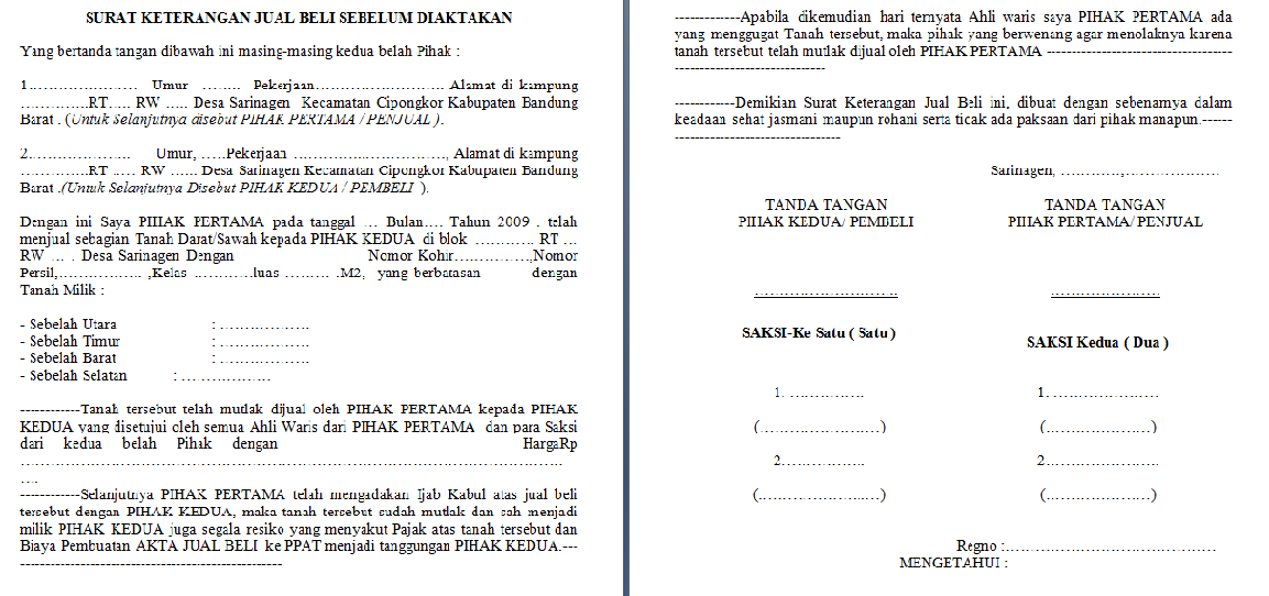Klik tombol di bawah berikut dan dapatkan contoh surat jual beli tanah word yang bisa digunakan langsung untuk keperluan perusahaan dan pribadi. Selanjutnya pihak pertama telah melakukan perjanjian atas jual beli tanah warisan tersebut dengan pihak kedua, olehnya itu secara resmi tanah warisan tersebut. Diatas adalah contoh dari surat jual beli tanah yang baik dan benar yang bisa anda tiru atau contoh sebagai acuan dalam membuat surat tersebut. Pictures gallery of contoh surat perjanjian jual beli tanah warisan. Jika dalam jual beli biasa penjual atau orang yang namanya tercantum di sertifikat hadir untuk menandatangani akta jual beli, namun pada proses jual beli tanah warisan ini yang menjadi penjual adalah ahli waris dari orang yang meninggal (pewaris) dan adanya kewajiban membayar pajak waris.